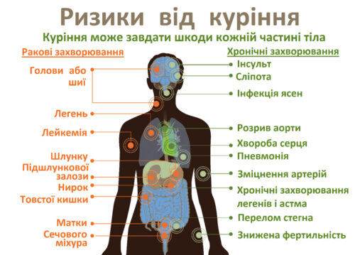 - захворювання серцево-судинної системи: куріння значно підвищує ризик розвитку хвороб серця та судин, включаючи інфаркти, інсульти та артеріальну гіпертензію;